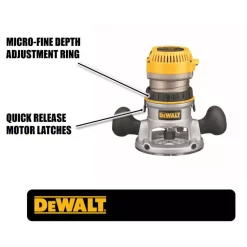 The DEWALT DW618K Router is designed with a 2-1/4 HP (maximum motor HP), 12.0 Amp electronic variable speed motor that provides the power to rout smoothly through the toughest hardwoods. This router features electronic variable speed with full feedback control for constant speed under load from 8,000-24,000 rpm and soft start to reduce start-up torque for enhanced control. A micro-fine depth adjustment ring provides precise depth adjustments in 1/64 in. increments and adjusts vertically for a constant switch/cordset location.
