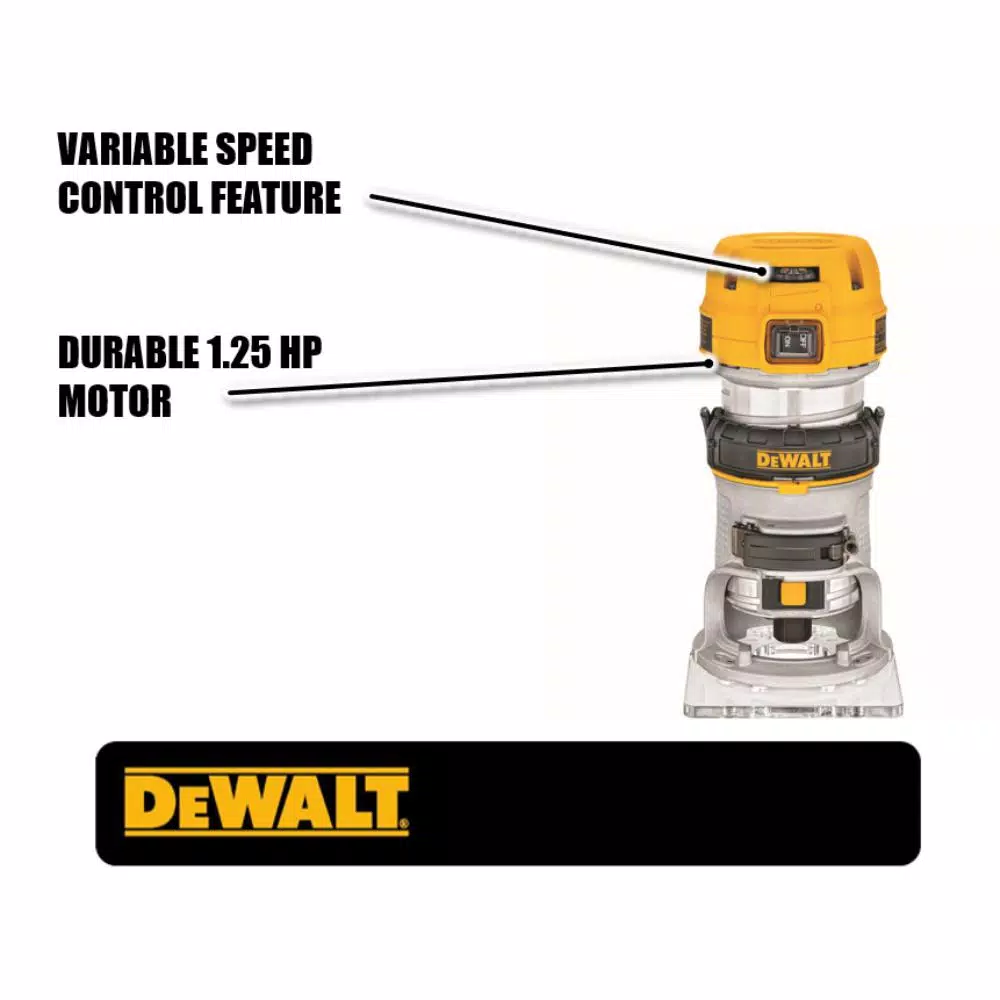 The DEWALT 1.25 HP variable speed Compact Router lets you determine the speed you need for the application at hand. A low, contoured grip close to the work surface gives you excellent precision and control, no matter whether youโre making small bevel cuts or large edge profiles. The heavy duty, soft starting motor features full time electronic feedback that maintains motor speed through the cut. A depth-adjustment ring provides controlled bit depth changes to 1/64 in.