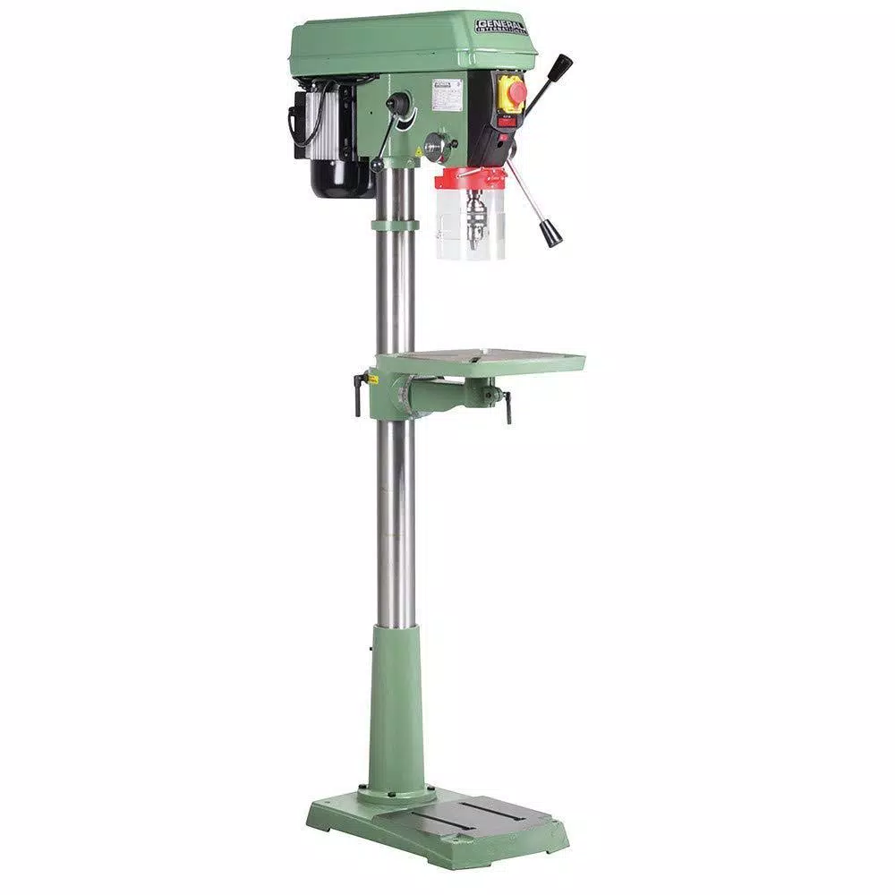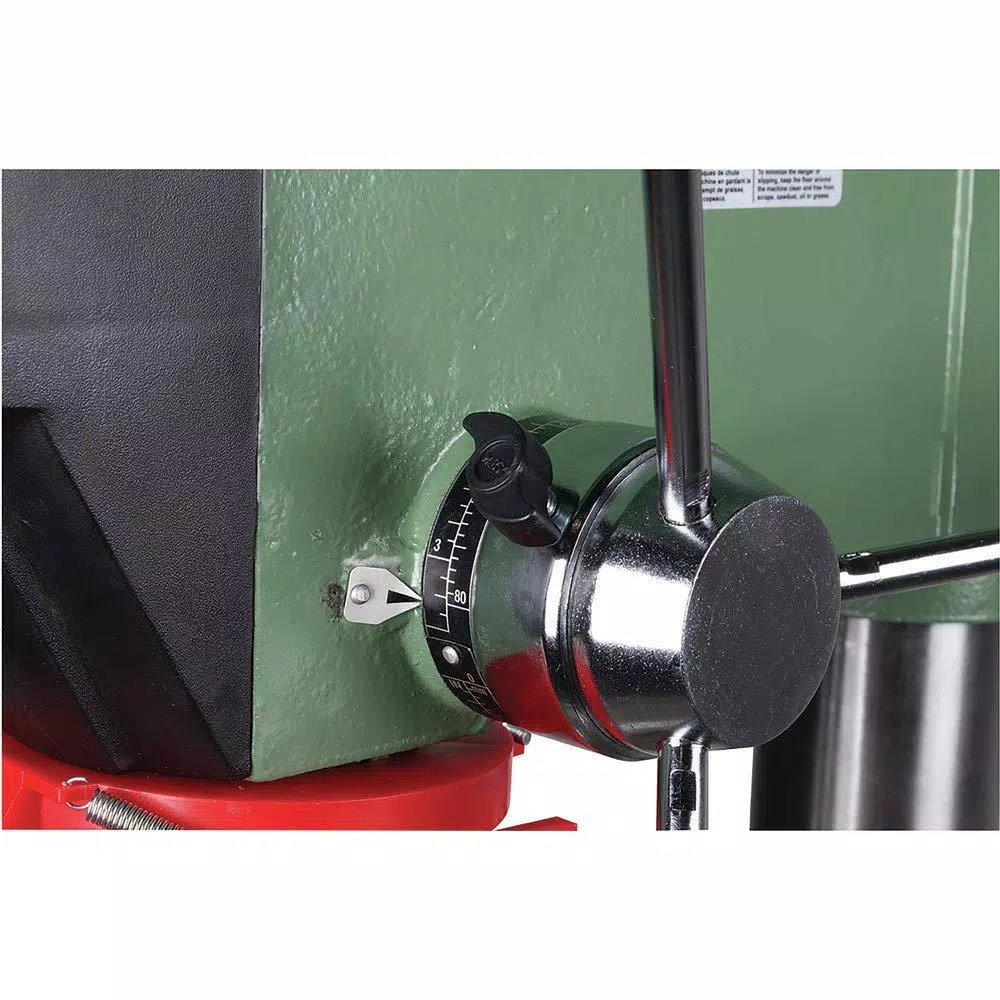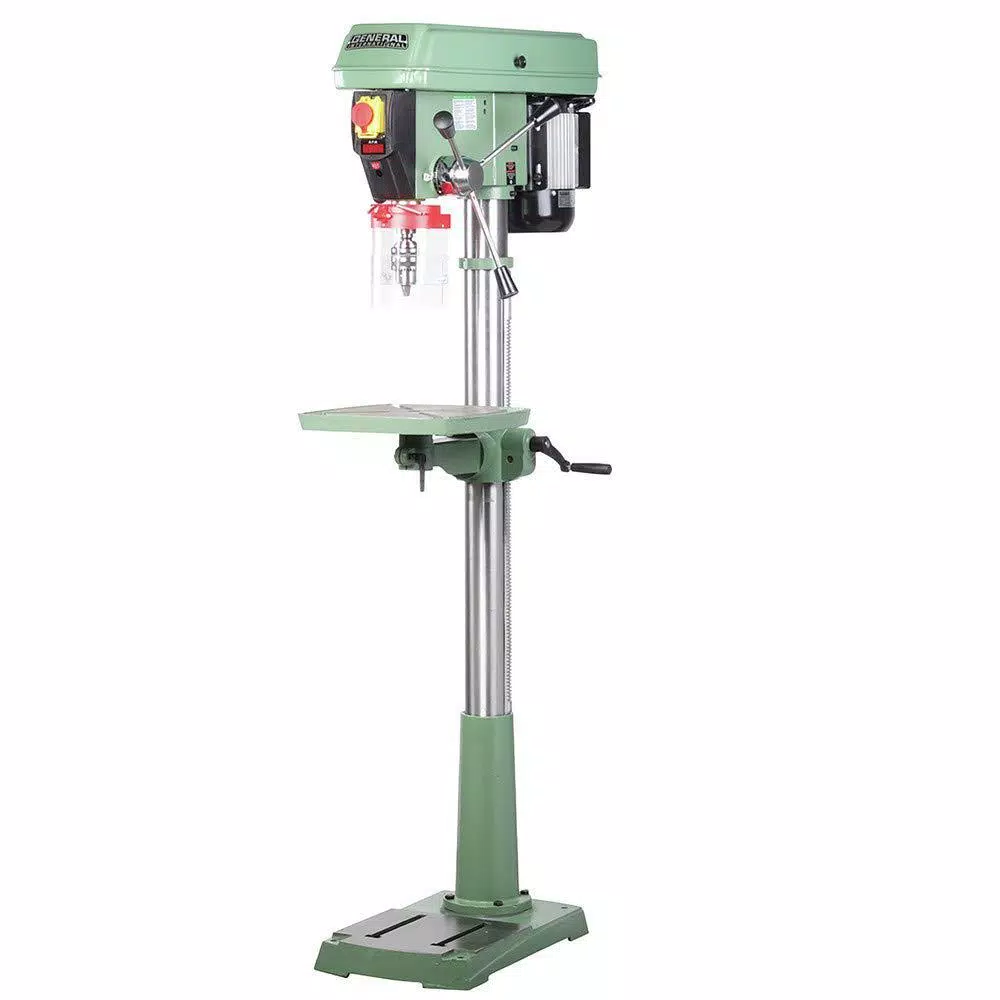 General International specializes in high quality woodworking and metal working machinery. The 17 in. Drill Press features an adjustable spindle tension return spring, built-in laser pointer, sturdy design with cast-iron head, base and table. With simple hand lever controlled mechanical variable speed (280 RPM to 2100 RPM) and Digital spindle speed display. High-quality bearings for smooth, vibration-free operation. The drill is fitted with a 3/4 HP industrial-quality 120-Volt motor (6 Amp). Equipped with easy-to-adjust dual depth stop for complete control of both down stroke depth and upstroke travel. 5/8 in. chuck with key and convenient on-board chuck key holder. Easy-to-use see-through flip-up chuck guard included. Crank-operated rack and pinion table height adjustment. Forced opening line interrupter switch, requires machine restart in case of power failure or circuit interruption. Covered by a 2-year Limited Warranty.