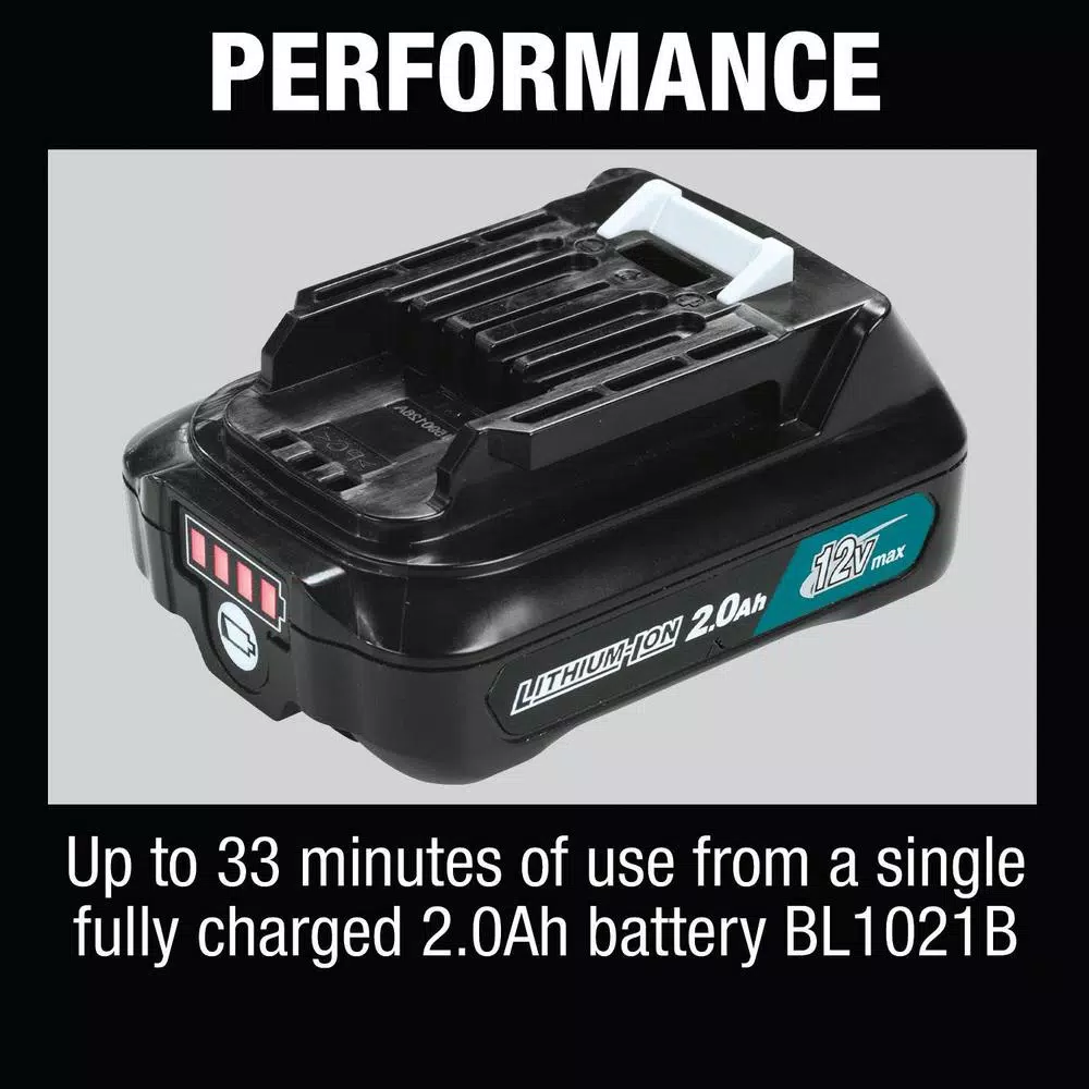 - Up to 33-minutes of continuous use from a single fully charged 2.0 Ah battery BL1021B