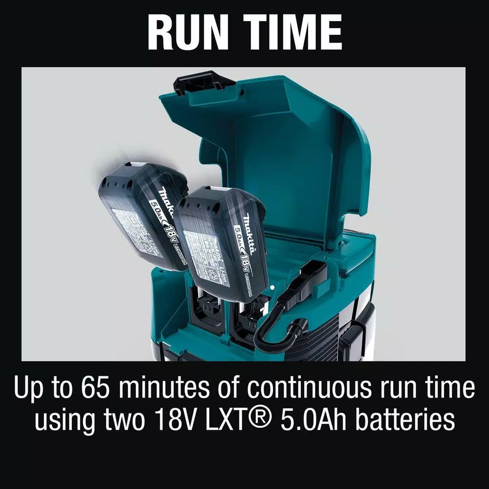 - Up to 65-minutes of continuous run time on low setting and 30-minutes on high setting using two 18-Volt LXT lithium-ion 5.0 Ah batteries BL1850B