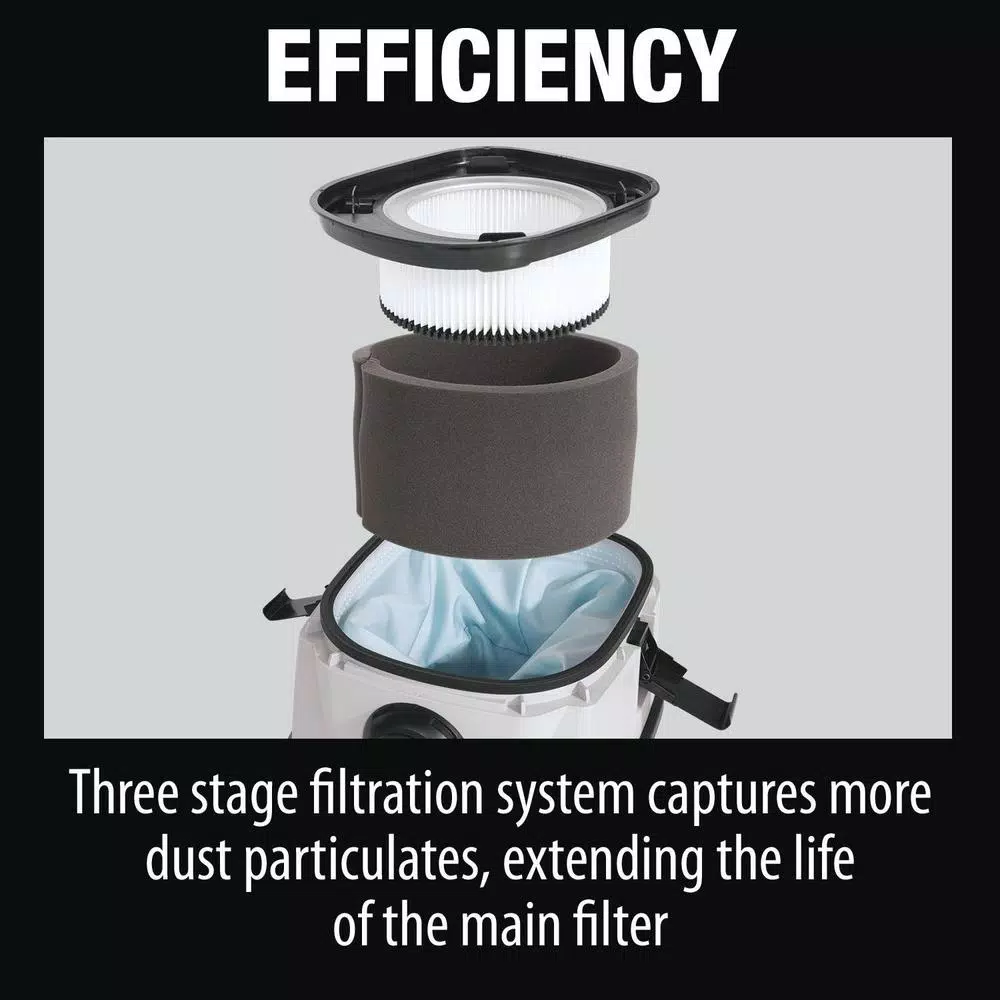 - Efficient three stage HEPA filtration system captures 99.97% of particulates 0.3 microns and larger extending the life of the main filter