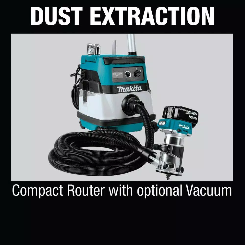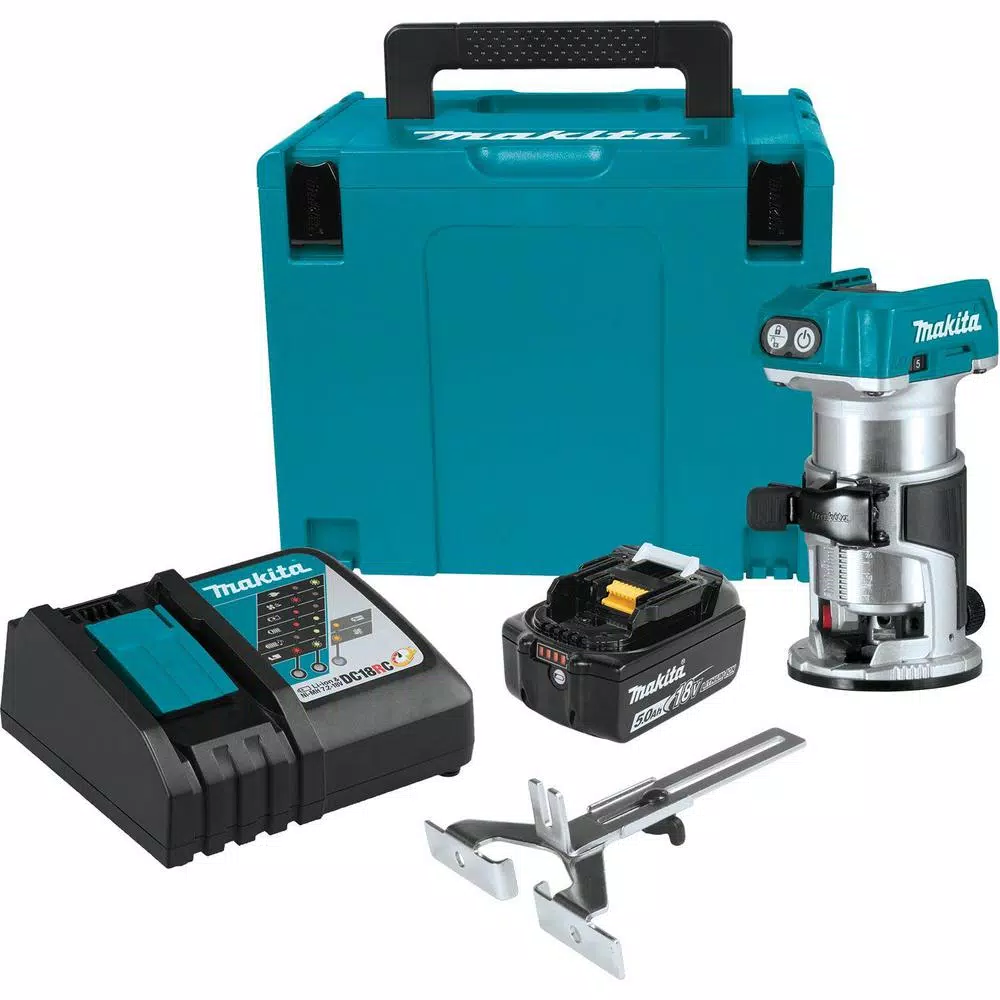 Corded power meets cordless convenience with the 18-Volt LXT Brushless Compact Router Kit, model XTR01. The 18-Volt LXT Router has an efficient Makita BL Brushless Motor for up to 50% longer run time, increased power and speed and longer tool life. The kit includes an efficient 18-Volt LXT 5.0 Ah battery, which reaches a full charge in only 45-minutes the fastest charge-time in the category for less downtime and increased productivity. The XTR01 Router is engineered for a full range of cabinetry and woodworking applications. It has a variable speed control dial (10,000 30,000) RPM) to match the speed to the application, with electronic speed control to maintain constant speed under load and soft start feature for smoother start-ups and better accuracy. Convenience features include the smooth rack-and-pinion fine depth adjustment system for more precise settings, dual L.E.D. lights to illuminate the work surface and a quick release cam lock system for convenient depth adjustments and base removal/installation. The kit includes a fixed base, straight guide, rapid charger, 1 battery, case and foam insert for case and additional bases and attachments are available (sold separately). For users of corded Makita Compact Routers (models RT0700C, RT0701C), the bases used with these corded routers are fully compatible with the XTR01.