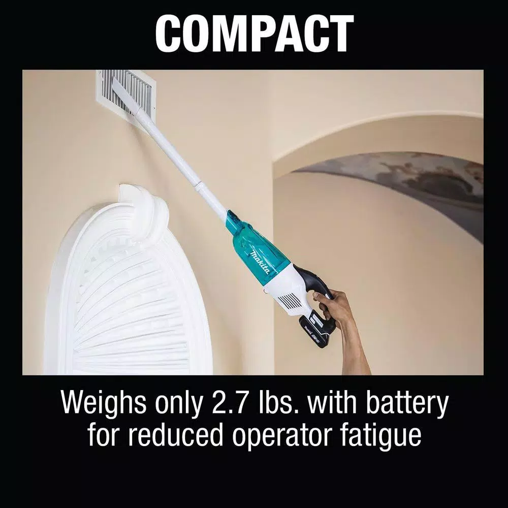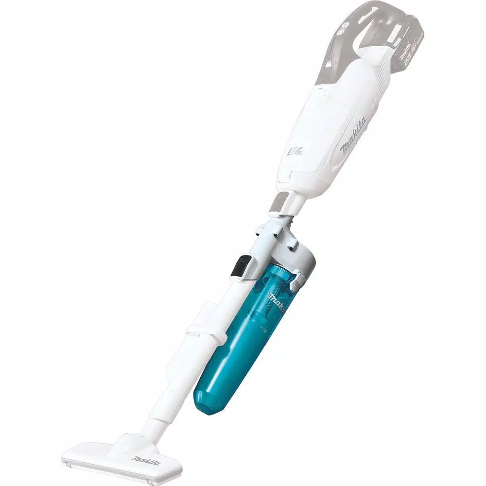 The Makita 18V LXT Brushless Cordless Vacuum Kit, model XLC03R1WX4, is a compact and powerful cordless vacuum with strong suction for fast and efficient cleaning. The vacuum can be used with trigger mode or slide switch mode for ease and convenience. Compact and ergonomic design for operator comfort and, at 2.7 lbs., is lightweight for reduced operator fatigue. A bagless cloth filtration system allows for easier cleaning and quicker debris disposal. The vacuum and included nozzle and attachment feature the distinctive teal and white trade dress. The XLC03R1WX4 is a kit and includes 1 fast-charging 18V LXT 2.0 Ah lithium-ion battery and efficient Rapid Optimum Charger. The powerful Makita-built motor delivers up to 49 CFM. Its part of Makitaโs expanding 18V LXT system, the worlds largest cordless tool system powered by 18V lithium-ion batteries. Makita 18V Lithium-Ion Batteries have the fastest charge times in their categories, so they spend more time working and less time sitting on the charger. For improved tool performance and extended battery life, Makita created Star Protection Computer Controls. Star Protection is communication technology that allows the Star Protection-equipped tool and battery to exchange data in real time and monitor conditions during use to protect against overloading, over-discharging and overheating. This bundle also comes with 191D70-5 White Cyclonic Vacuum Attachment w/Lock.