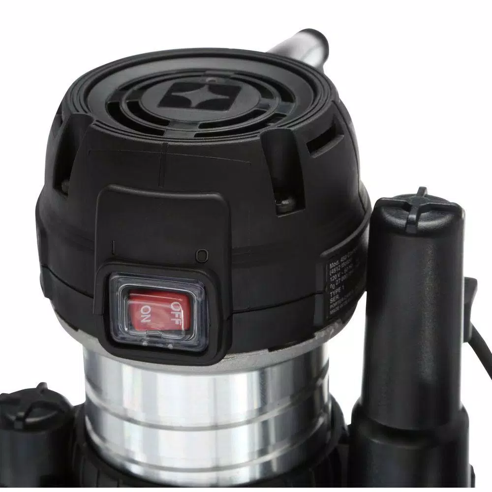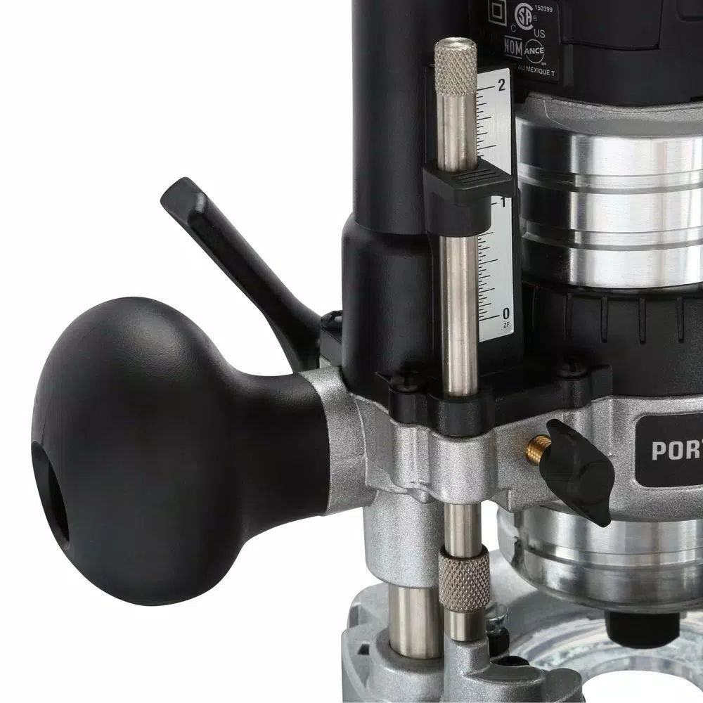 Durable and powerful to tackle you toughest routing applications, the Porter Cable 1-1/4 HP Compact Router with Plunge Base and Bag has a soft-starting motor with full-time electronic feedback that maintains motor speed throughout the cut. Compact and lightweight with overmold rubber handles for comfortable use and a secure grip, the large, low-pressure spindle lock button allows for single wrench bit changes, while the spring-loaded release tab allows for quick base removal. Featuring an adjustment ring that enables controlled bit depth changes to within 1/64 in., this router has a large plunge base for added stability for your heavier applications.