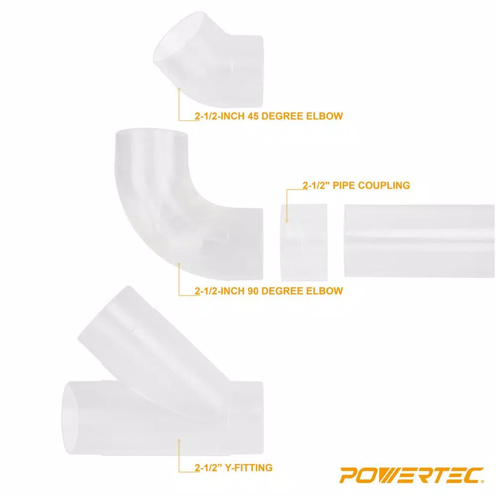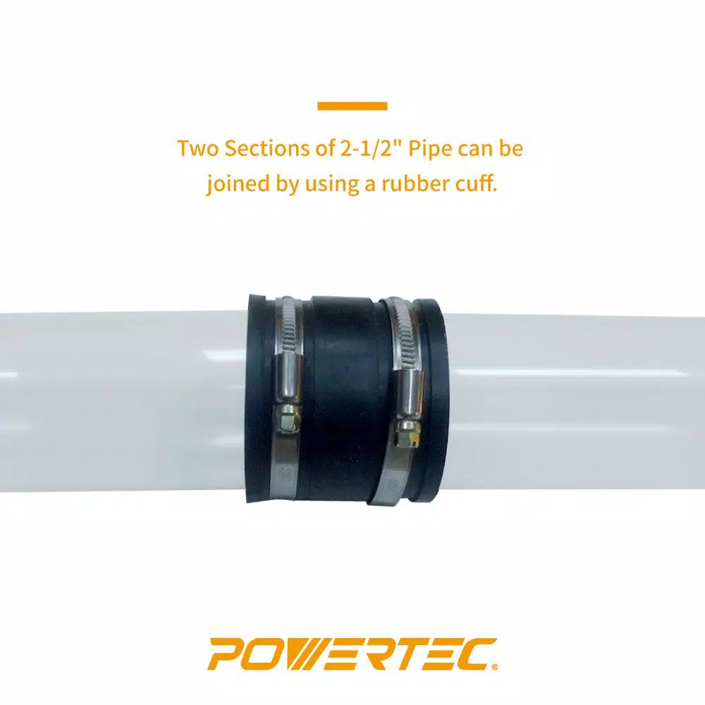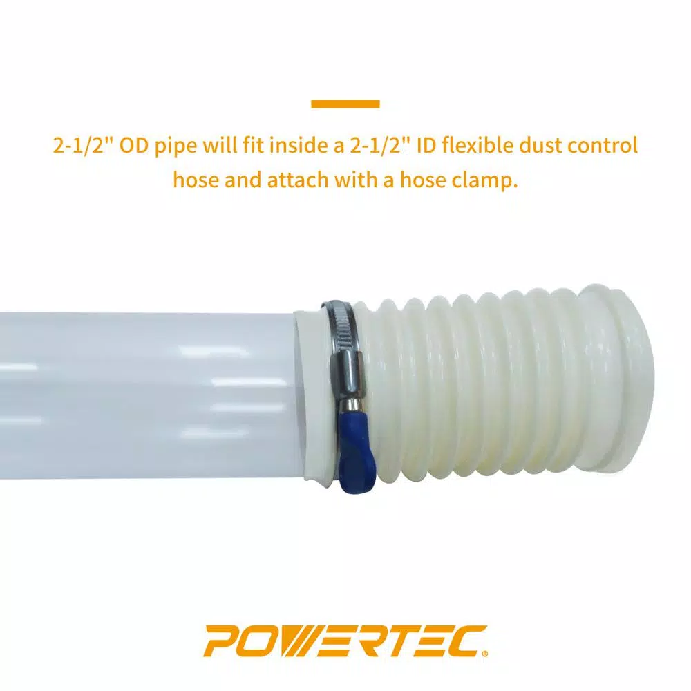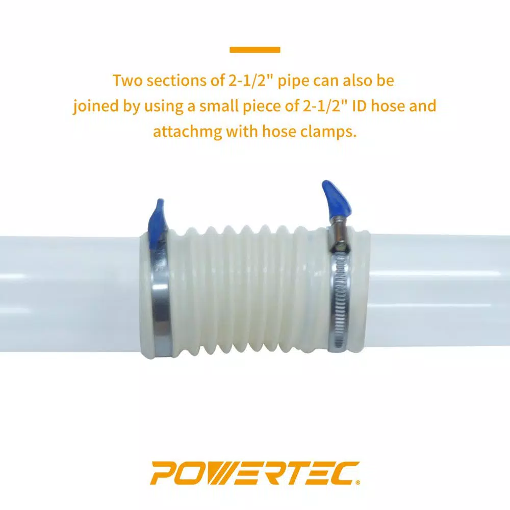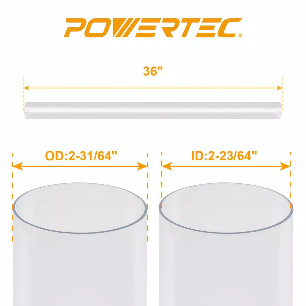 ใThe 2-1/2-Inch x 36-Inch Long Clear Pipe by POWERTECใ Our 36 inch long clear plastic pipe was designed to work with hoses and/or ports with 2-1/2โ ID โ providing a highly efficient extension tube or foundation for your dust collection system. Made with top grade PVC plastic, this tubed fitting possesses a lightweight, yet rigid profile ideal for an assortment of dust collection system and woodworking applications. Itโs tough, stable and features exceptional impact resistance for day to day usage. ใChosen by the Expertsใ When tested and compared to standard dust collection hoses, many professionals preferred this rigid piping material for long distance dust collection and improved workflow. Additionally, the transparent, see-thru profile allows the user to view the efficient air flow of dust providing optimal dust extraction. ใSpec.ใ2-1/2 in. O.D. for fit onto your 2-1/2 in. dust hose, couplers or fittings. Pipe length: 36 in. Weight: 13 oz. Wall thickness: 5/64 in.