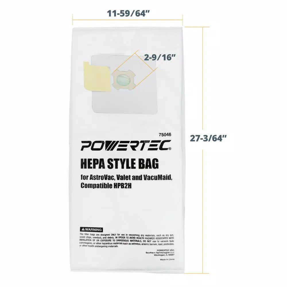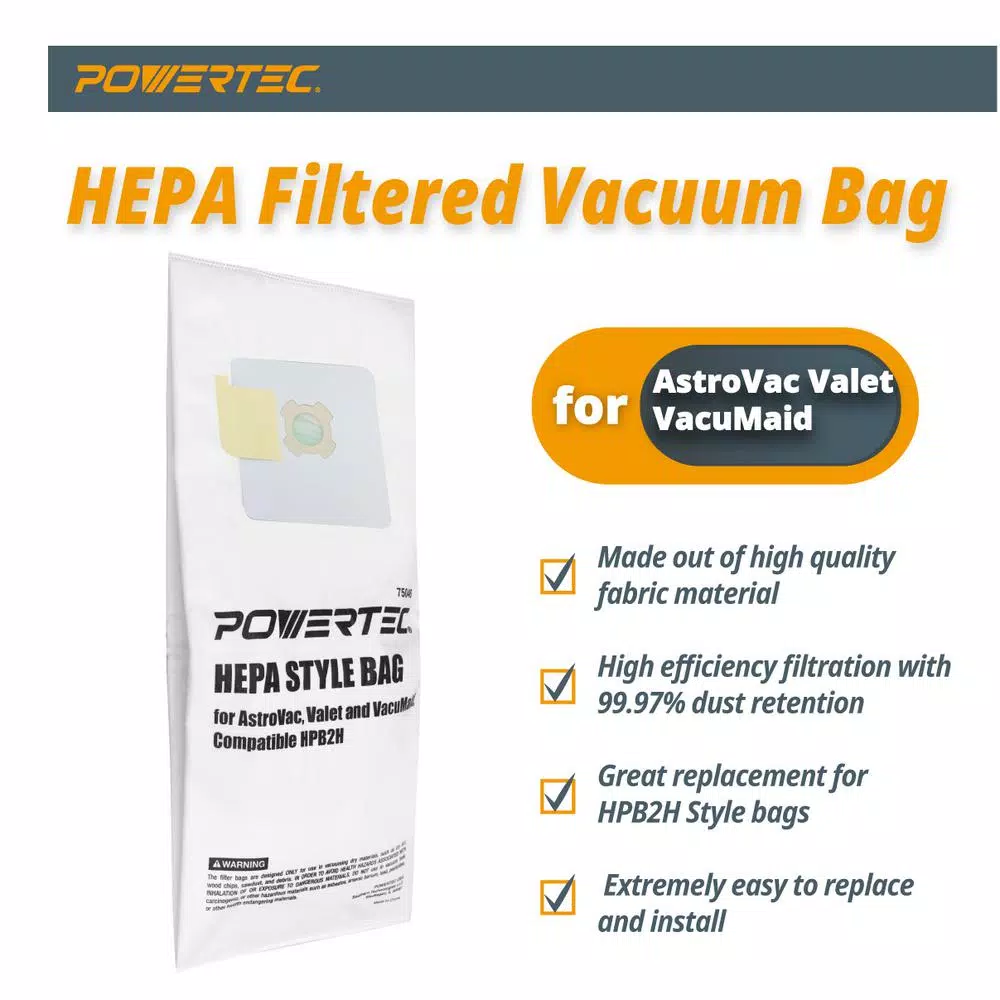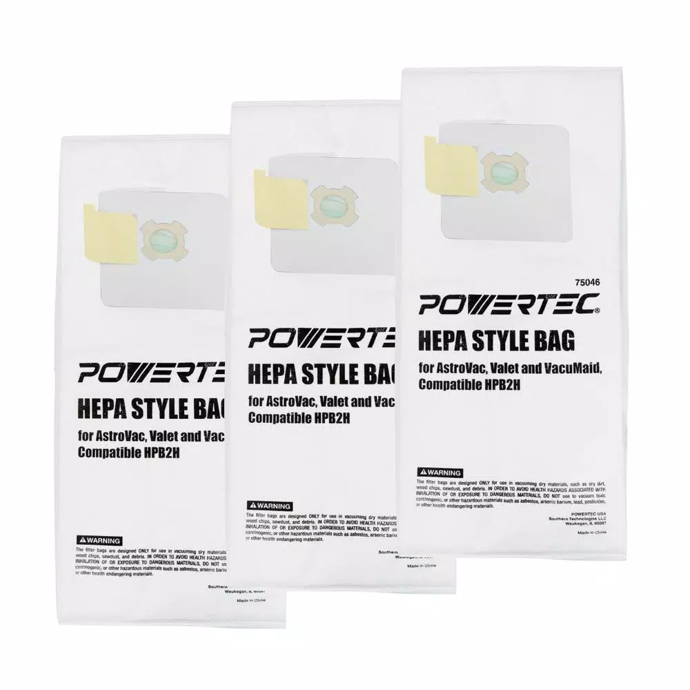Introducing the 3-Pack HPB2H HEPA Bags by POWERTEC. Whether installed on your wall mounted shop vac or centralized vacuum, capturing small debris and fine dust particles is essential to maintaining a clean, safe and healthy working environment. With these HEPA filter style bags, no dirt will escape. Made with high quality fabric material, these dust capturing bags offer 5 layers of high efficiency filtration that screens out more than 99.97% of particulates. These easy to install bags are durable for long term use, but wont clog once full and are extremely easy to replace once full. Simply slide the cardboard/ rubber seal over the bag inlet fitting and its back to perfectly sealed dust capturing. Replacement Bag Compatibility: Valet – ATQ300 Vacumaid – GV30 GV50 GV30PRO GV50PROAstroVac – H1P P70 SR36 SR38 SR52H SR760 P80 H2 P73 P75 MK-IP MK-XXIIIBP(Also compatible with any central vacuum with an HPB1 paper bag.).