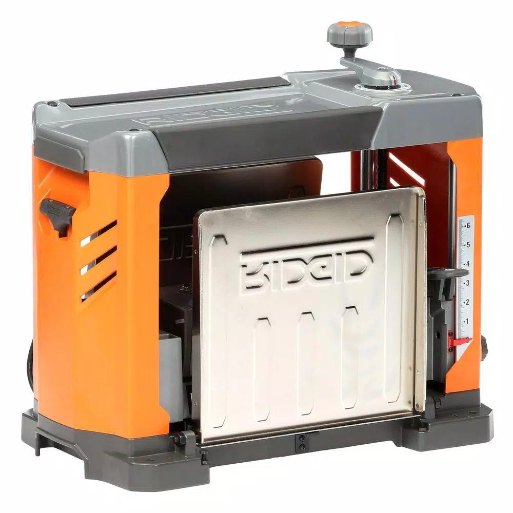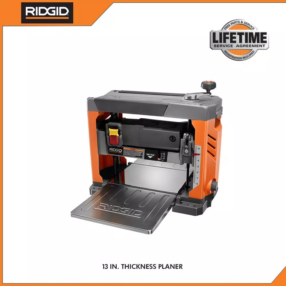 RIDGID introduces the 13 in. Thickness Corded Planer. This planer has a 120-Volt, 15 Amp motor that delivers 9000 RPM for maximum power and continuous operation. It features a 3-blade cutter head with quick-changing, dual-edge blades that are reversible and self-aligning for a smooth surface with minimal blemishes. The multiple depth features help you achieve your desired depth and the 13 in. wide feed capacity is great for planning large stock. Backed by the Industry Leading Lifetime Service Agreement, the 13 in. Corded Thickness Planer includes a magnetic blade wrench, a depth adjustment handle, a switch key, a dust port, and an operatorโs manual.