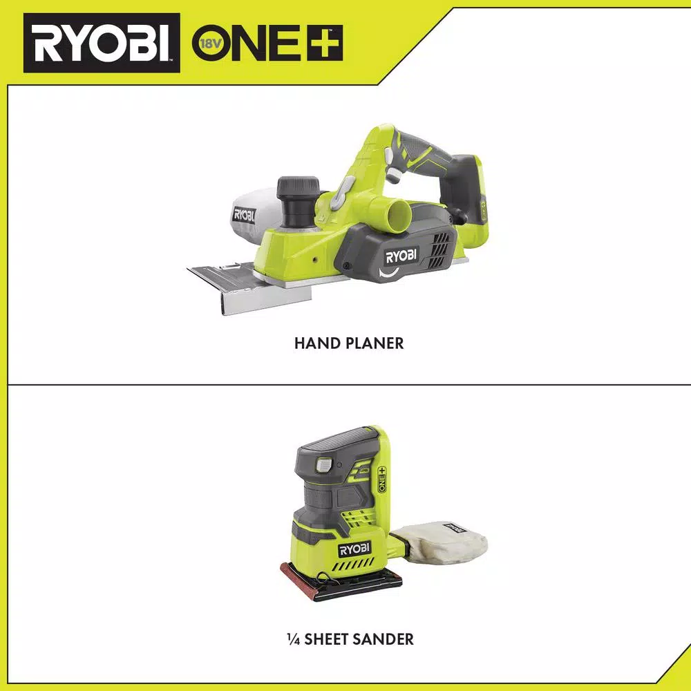RYOBI introduces the 18-Volt ONE+ Cordless 3-1/4 in. Planer and 1/4 Sheet Sander with Dust Bag (Tools Only). This planer has an incredible 3 in. to1/4 in. cut width and up to 1/16 in. cutting depth per pass. The 3-1/4 in. Planer is loaded with great features such as its automatic kickstand which helps prevent you from marring your work piece and has a convenient on-board blade wrench storage. The dual left or right chip exhaust also gives you the freedom to choose what you are most comfortable with. The ONE+ 1/4 Sheet Sander is great if used for a variety of finishing applications and its cordless convenience makes it easy to move from jobsite to jobsite or for DIY jobs anywhere around your home. It features a 1/4 sheet design that works with a majority of sandpapers and a lock on switch for easy operation. Its dust collection bag will keep your work surfaces clean, and its vacuum adaptor port will make clean up quick and easy (adaptor not included). With 12,000 RPMs and over 40 minutes of runtime, you will always have enough power to get the job done. Best of all, it is part of the RYOBI ONE+ System of over 175 Cordless Tools that all work on the same battery platform. Backed by the RYOBI 3-Year Manufacturerโs Warranty, the 3-1/4 in. Planer and 1/4 Sheet Sander Kit includes two reversible double-edged blades, a blade wrench, an edge guide, a planer dust bag, a sander dust bag, sandpaper assortment, a paper punch, and operatorโs manuals. Battery and charger sold separately.
