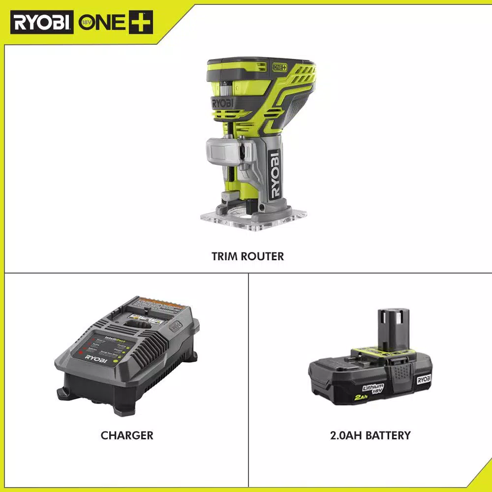 RYOBI introduces the 18-Volt ONE+ Cordless Fixed Base Trim Router with Tool Free Depth Adjustment with 2.0 Ah Battery and Charger Kit. This Trim Router allows the user to create the perfect edge with the correct router bit and optional woodworking base. With 29,000 RPM, you can trim quickly and efficiently. The router features a compact design for fine routing. The battery in this kit features lithium-ion battery cells, providing the user with up to 1.5X more runtime compared to Ni-Cd counterparts. The battery is engineered to deliver fade-free power for maximum performance. The 18-Volt ONE+ Dual Chemistry IntelliPort Charger is compatible with all RYOBI ONE+ lithium-ion batteries and features IntelliPort Technology to maximize the lifetime of your RYOBI batteries. Best of all, it is part of the RYOBI ONE+ System of over 175 cordless tools that all work on the same battery platform. Backed by the RYOBI 3-Year Manufacturerโs Warranty, this kit includes the Fixed Base Trim Router, a collet wrench, an 18-Volt ONE+ 2.0 Ah Compact Lithium-Ion Battery, a Dual Chemistry IntelliPort Technology Charger, and an operatorโs manual.