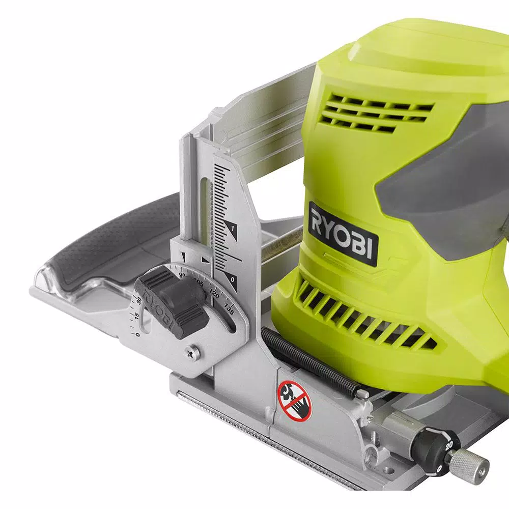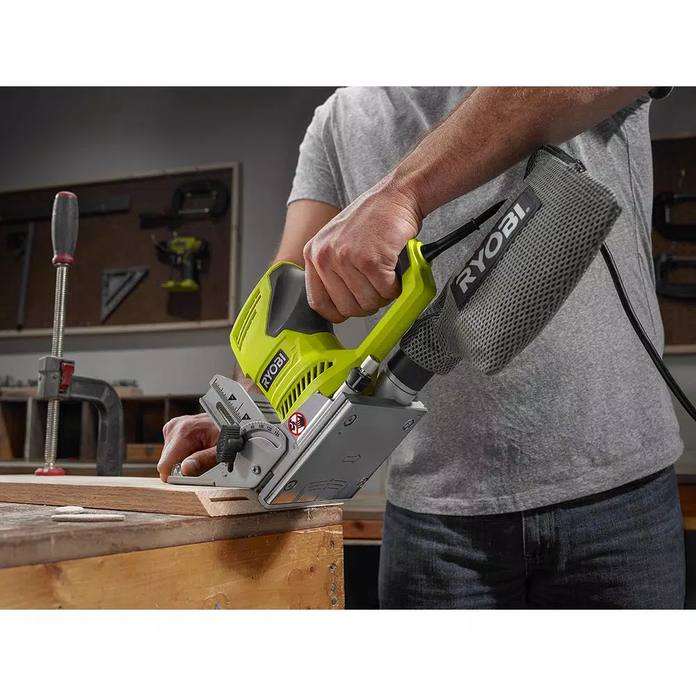 RYOBI presents the RYOBI Biscuit Joiner Kit. This biscuit joiner cuts slots for holding biscuits with precision. It has the capability of cutting angles from 0ยฐ to 135ยฐ with positive stops at 0ยฐ, 45ยฐ, 90ยฐ and 135ยฐ. It features a carbide tipped blade, accurate metal fences with rack and pinion adjustment and an ergonomic handle for comfort during prolonged use. This tool has a powerful 6 Amp motor that delivers up to 11,000 RPM which provides power for working in the hardest woods. To learn more about RYOBI tools, go to RYOBItools.com and check out RYOBI Nation.