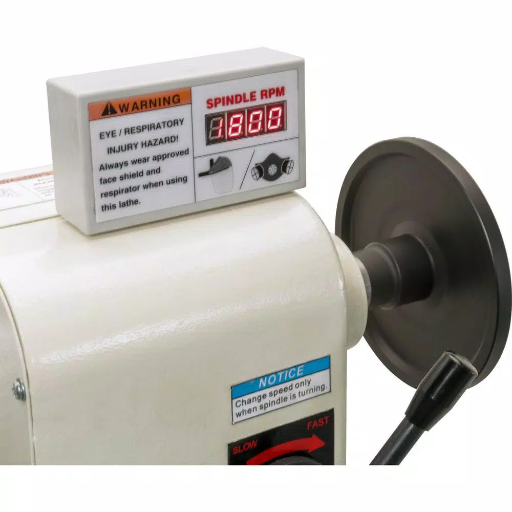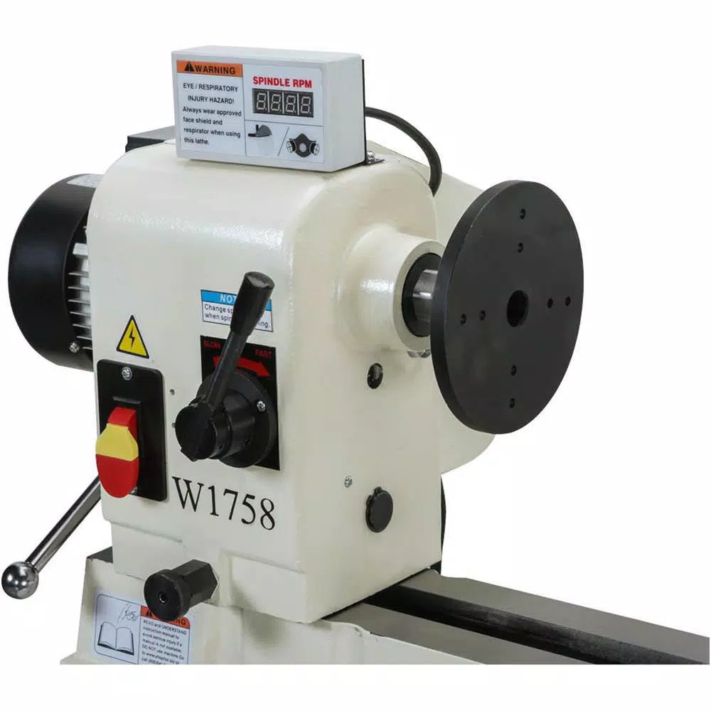 Here it is. Our fully featured, large-capacity wood lathe at a competitive price. Featuring a hefty 2 HP motor, variable-speed spindle, a swivel-head for outboard turning, a digital tachometer for setting the exact spindle speed, precision-ground cast-iron bed, headstock and tailstock for quick locks and heavy cast-iron legs with floor-mounting holes for the ultimate in stability. Go ahead. Try 1 out for yourself. This beauty will handle it all.