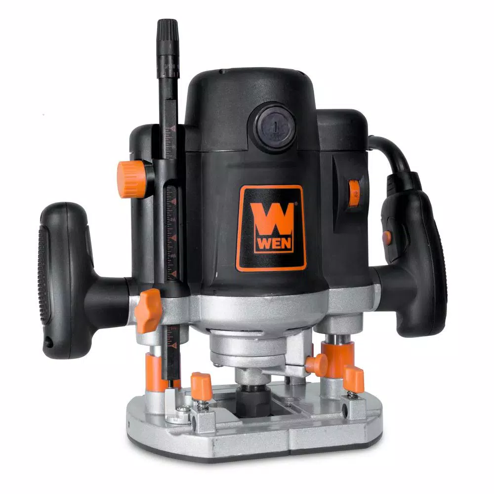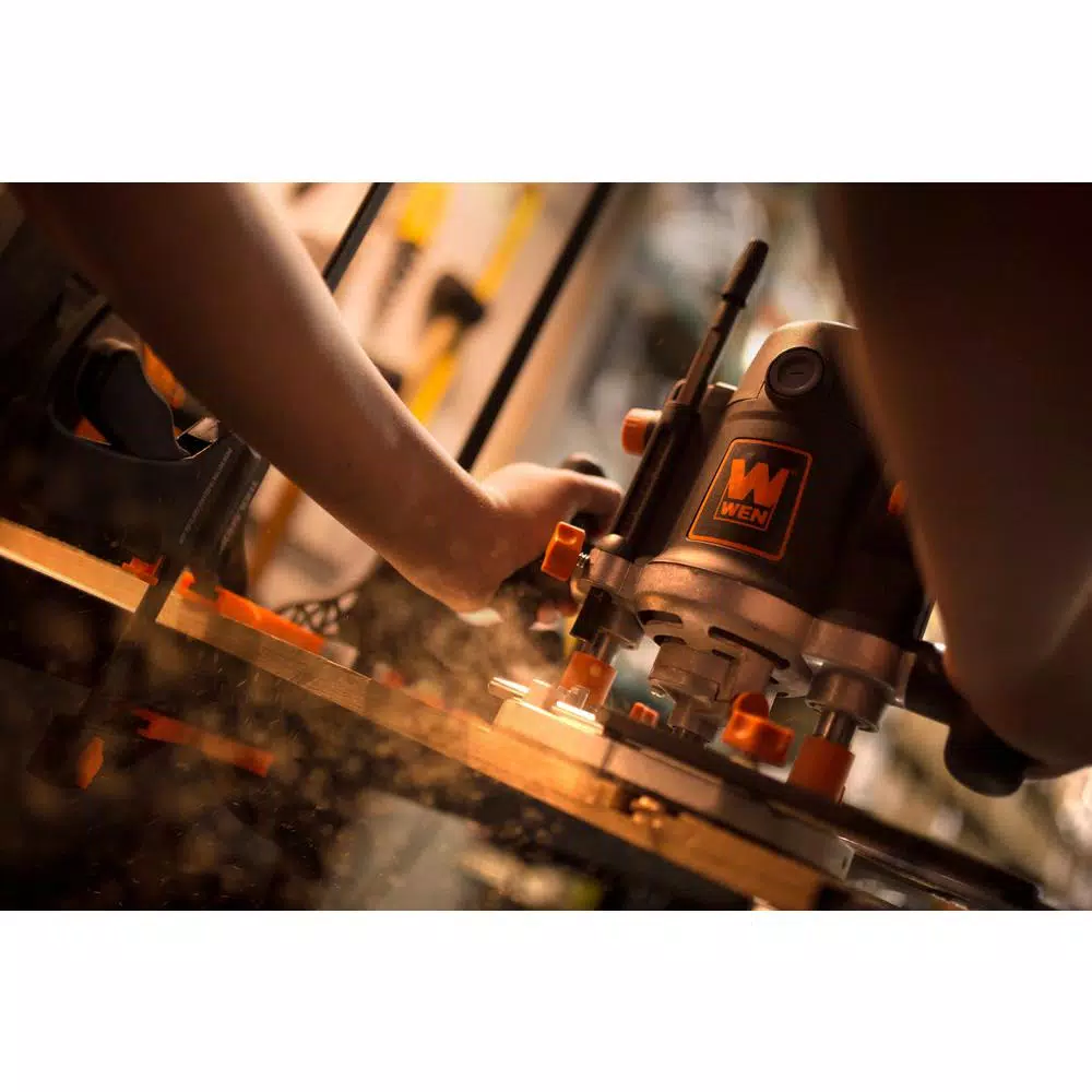 Make intricate patterns in both the exterior and interior of your workpieces with the WEN 15 Amp Variable Speed Plunge Router. This versatile machine features a variable speed 15 Amp motor, providing users speeds from 8,000 RPM to 23,000 RPM. The 1/2 in. collet includes an additional 1/4 in. Adapter, allowing for compatibility with a wide variety of bits. Our soft startup design prevents damage to your workpiece and lengthens the tools lifespan. The spring-loaded base features a lock-down knob to turn your plunge router into a fixed router. The intricate depth stop system features a 7-stop turret, a depth adjustment dial that advances the depth stop 5/16 of an inch per quarter turn, and a fine-tune adjustment dial that advances it 1/128 of an inch per quarter turn. The included guide fence lets users rout perfectly straight lines, helping to create dadoes and grooves along the workpiece. This kit comes packed with accessories, including a hard-shelled blow mold carrying case, a 1-1/2 in. Dust collection duct, a bit-changing wrench, a straight-edge guide fence, a fence scale, a centering pin for cutting circles, a profile guide for routing edges of curvy workpieces, and a template guide for creating more complex shapes. And, because its a WEN product, your woodworking router comes backed by a 2-year warranty, a stocked inventory of replacement parts, and a friendly customer help line.