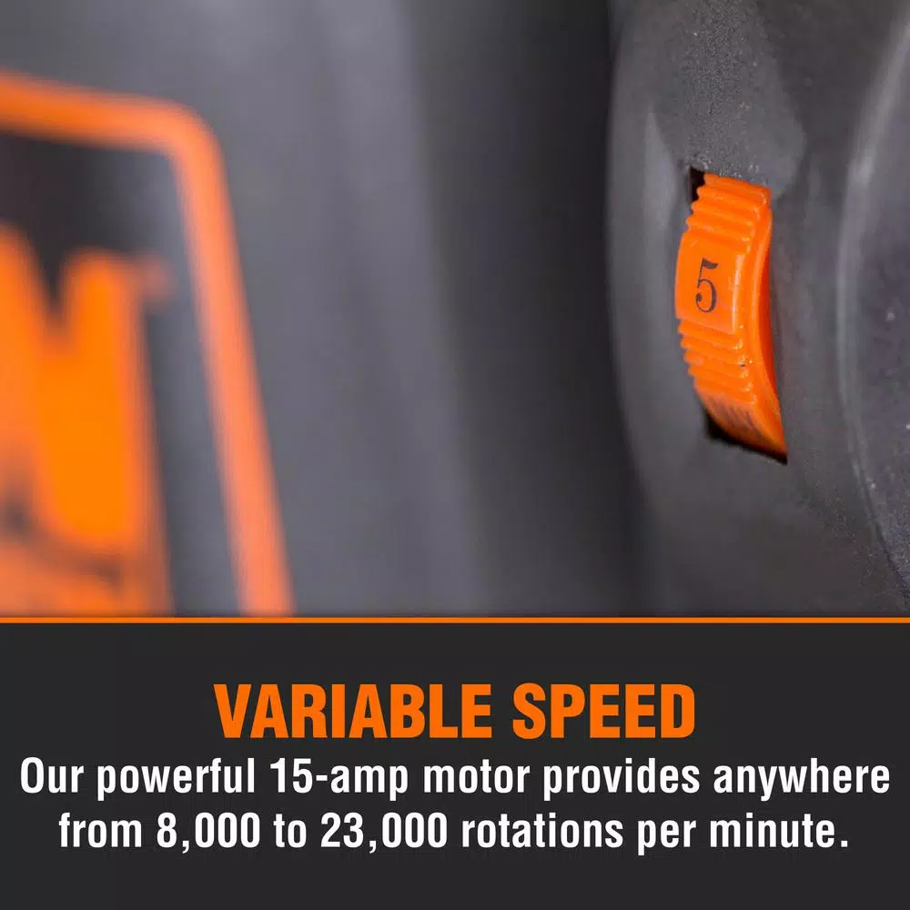 - Powerful 15 Amp variable speed soft start motor provides speeds from 8,000 RPM to 23,000 RPM