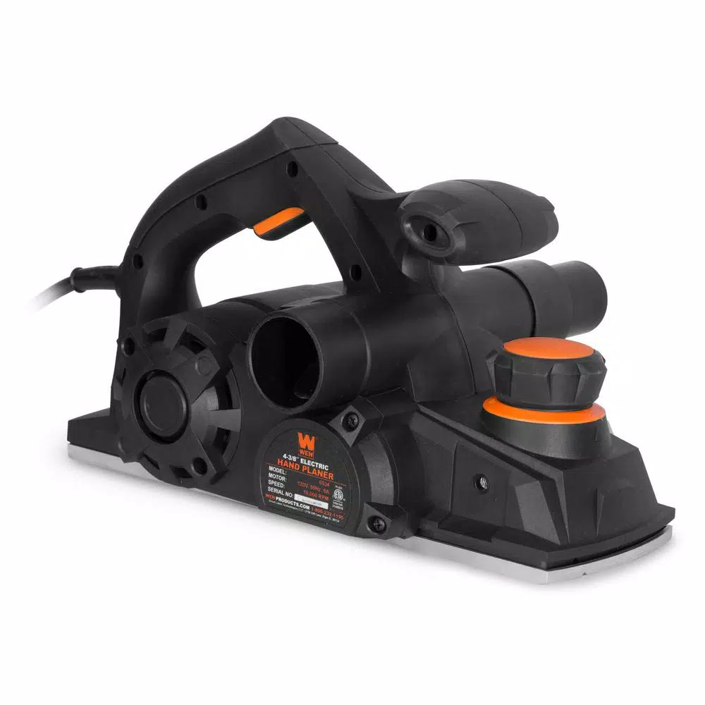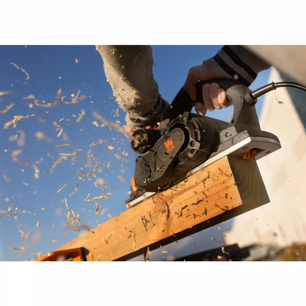 Remember when you needed to smooth out those joists? Plane away chips, splinters and misshapen edges with the WEN 8 Amp 4-3/8 in. Electric Hand Planer. Take on 2x4s and 4x4s with the spacious 4-3/8 in. cutterhead. Perfect for fixing stubborn doors and fitting wood. This power planerโs 8 Amp motor delivers over 32,000 cuts per minute to your workpiece, slicing away any irregularities until the surface of your boards are aligned and smooth. With a cutting width of 4-3/8 in. and a maximum cutting depth of 1/8 of an inch, youโll have the perfect companion for fitting and squaring boards. The 16 positive stops go from 0 all the way up to 1/8 of an inch in 1/128 in. intervals. The base plate shoe even includes two v-shaped chamfer grooves for easily flattening sharp post corners. The onboard kickstand protects both the blade and the workpiece by keeping the blade elevated and out of contact from the surface of your project in-between cuts. Finally, the dust adapter combined with the two-way dust port helps users manage loose shavings, keeping your work space clean and sawdust free. The included rabbeting guide helps create rabbets in your boards while the parallel fence bracket keeps your planer traveling perfectly straight. And because this is a WEN Product, your 8 Amp 4-3/8 in. Corded Hand Planer comes backed by a two-year warranty, a friendly customer help line and a nationwide network of skilled service technicians.